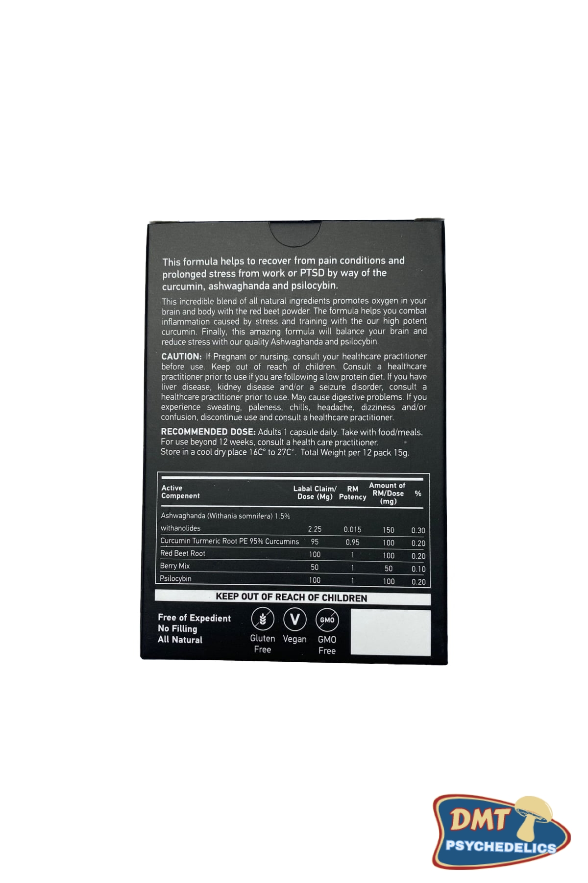 This formula helps to recover from pain conditions and prolonged stress from work or PTSD by way of the curcumin, ashwaghanda and psilocybin.